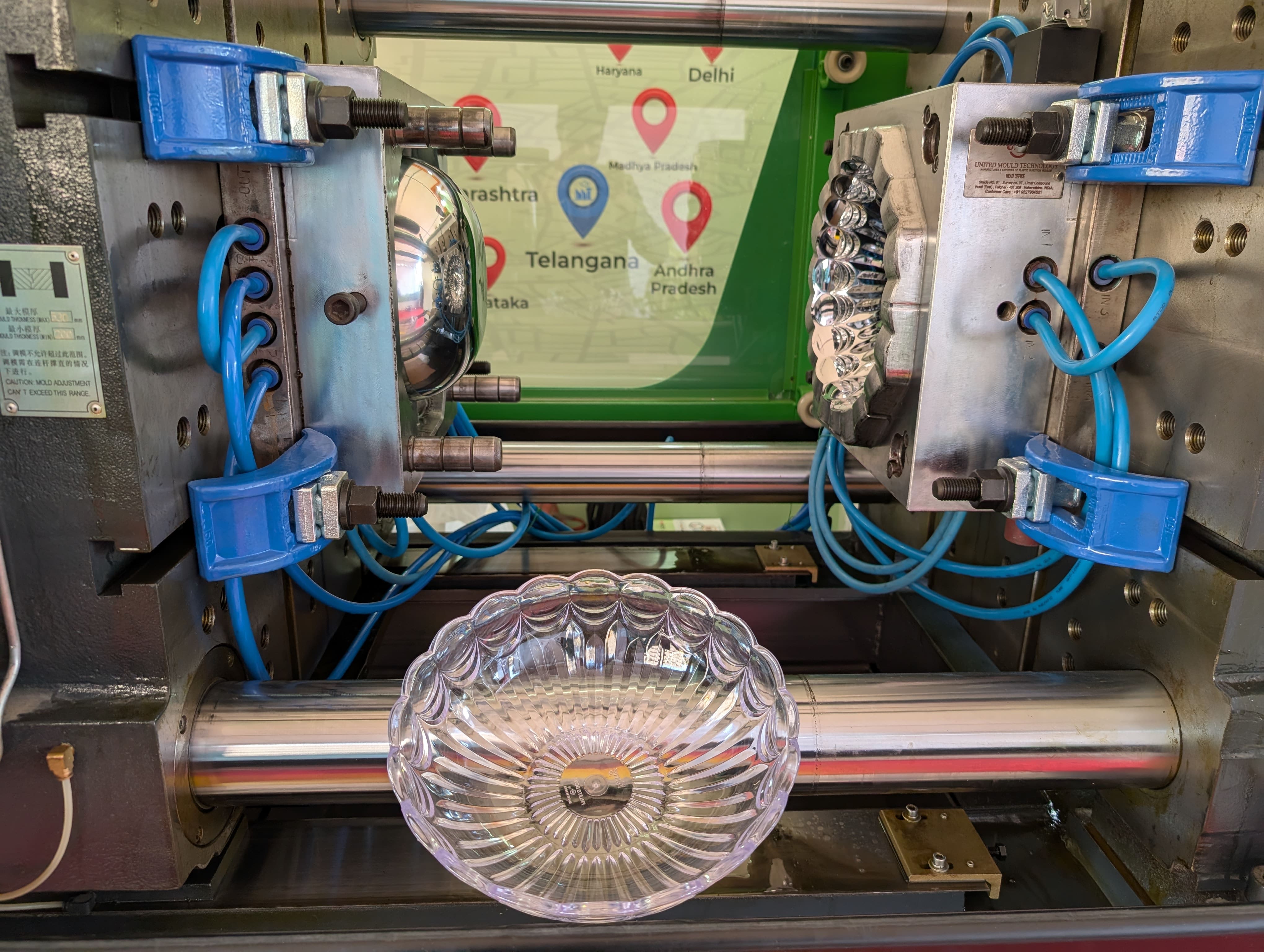 We were the only exhibitor with a live-running plastic injection moulding machine — a highlight that drew attention from every corner of the venue. Our robust 218 Ton DHARTI Series Plastic Injection Moulding Machine ran non-stop, manufacturing high-quality fruit bowls in front of a live audience. The machine operated alongside premium auxiliary equipment, ensuring a smooth, real-time demonstration of industrial-level production.